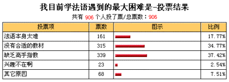 Il y a 906 personnes qui ont participé à ce vote. D’après les résultats, on peut bien connaître les difficultés que les élèves de français rencontrent dans leurs études. En fonction de ces résultats, on peut leur présenter des documents de français et prendre plus de temps pour construire la rubrique “Apprendre le français”. En somme, l’enquète sur Internet est une manière très bonne, qui demande peu d’investissement et qui permet d’obtenir un certain nombre de données très utiles. Grâce aux résultats, on peut mieux connaître les intentions des visiteurs et ajouter des contenus nouveaux au site. En plus de ce sujet, on peut aussi faire des autres enquêtes, par exemple: “Pourquoi apprennez-vous la langue française?” “Quelles rubriques préférez-vous sur le site?”