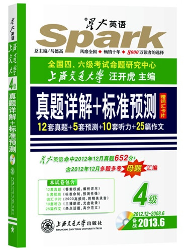 星火四六级,全国8000万读者,畅销10年。以其实用性和高性价比获得同学们的一致称赞!《大学英语词汇周计划》+《真题详解+标准预测》,词汇+10套真题+5套预测+10套听力+20篇作文,上海交大名师主编,《真题详解+标准预测》一书,更命中2012年12月真题652分! |