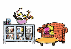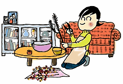 (1)応接間で花を生けました。 (2)応接間に花を生けました。