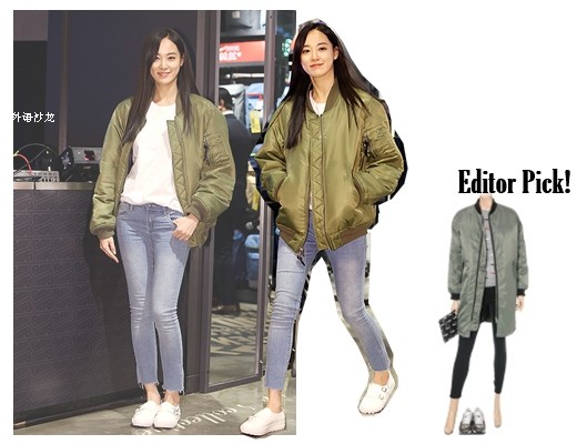 最近的天气时暖时冷,可以利用一款长及臀部的飞行员夹克来搭配牛仔裤。