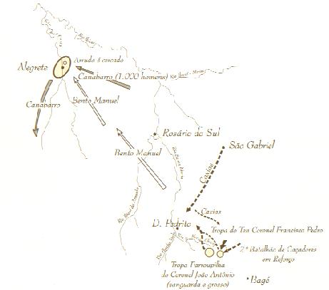Caxias ouvira tiros no dia 8 e receando que Bento Manuel houvesse encontrado Canabarro em sua marcha para Alegrete, enviou o Tenente-Coronel Francisco Pedro de Abreu (conhecido por Chico Pedro e Moringue) com 150 guardas nacionais para atacar o adversário pela retaguarda. Pouco depois soube que ocorrera apenas um tiroteio entre a flanco-guarda da coluna e um destacamento rebelde.